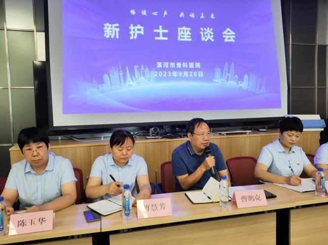 為加強(qiáng)醫(yī)院護(hù)理隊(duì)伍建設(shè),了解年輕護(hù)士思想動(dòng)態(tài),引導(dǎo)新護(hù)士成長,凝聚新生力量,切實(shí)解決他們在工作中遇到的問題和困難,近日,漯河市骨科醫(yī)院(漯河醫(yī)專二附院)護(hù)理部舉辦新護(hù)士座談會(huì)。副院長曹鵬克、護(hù)理部副主任趙春紅、曹慧芳、王爽及科室護(hù)士長代表出席會(huì)議,會(huì)議由護(hù)理部副主任王爽主持。