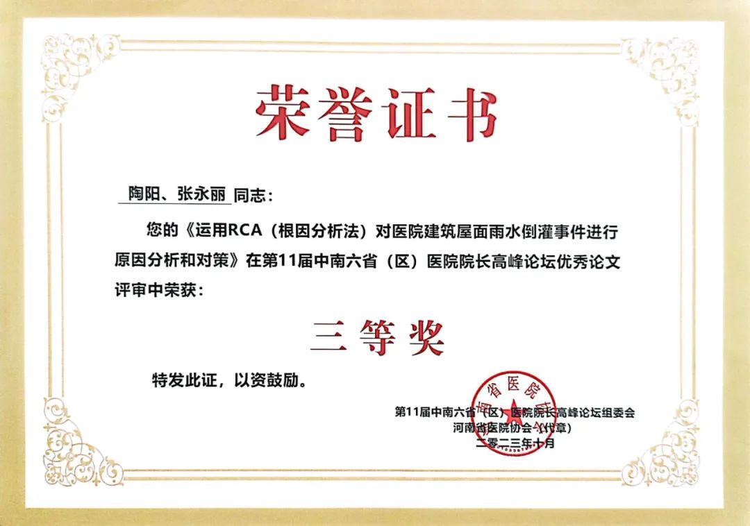 醫(yī)院總務(wù)科陶陽(yáng)、張永麗共同完成的《三級(jí)綜合醫(yī)院智慧后勤建設(shè)實(shí)踐探索》論文被河南省醫(yī)院協(xié)會(huì)授予2023年醫(yī)院管理優(yōu)秀論文二等獎(jiǎng),被第11屆中南六?。▍^(qū))醫(yī)院院長(zhǎng)高峰論壇組委會(huì)及河南省醫(yī)院協(xié)會(huì)共同授予優(yōu)秀論文三等獎(jiǎng)。以及《運(yùn)用RCA(根因分析法)對(duì)醫(yī)院建筑屋面雨水倒灌事件進(jìn)行原因分析和對(duì)策》被授予2023年醫(yī)院管理優(yōu)秀論文二等獎(jiǎng),進(jìn)一步被推送到中國(guó)醫(yī)院協(xié)會(huì)后勤專業(yè)委員會(huì)第二十七屆學(xué)術(shù)研討會(huì)上進(jìn)行學(xué)術(shù)交流。
