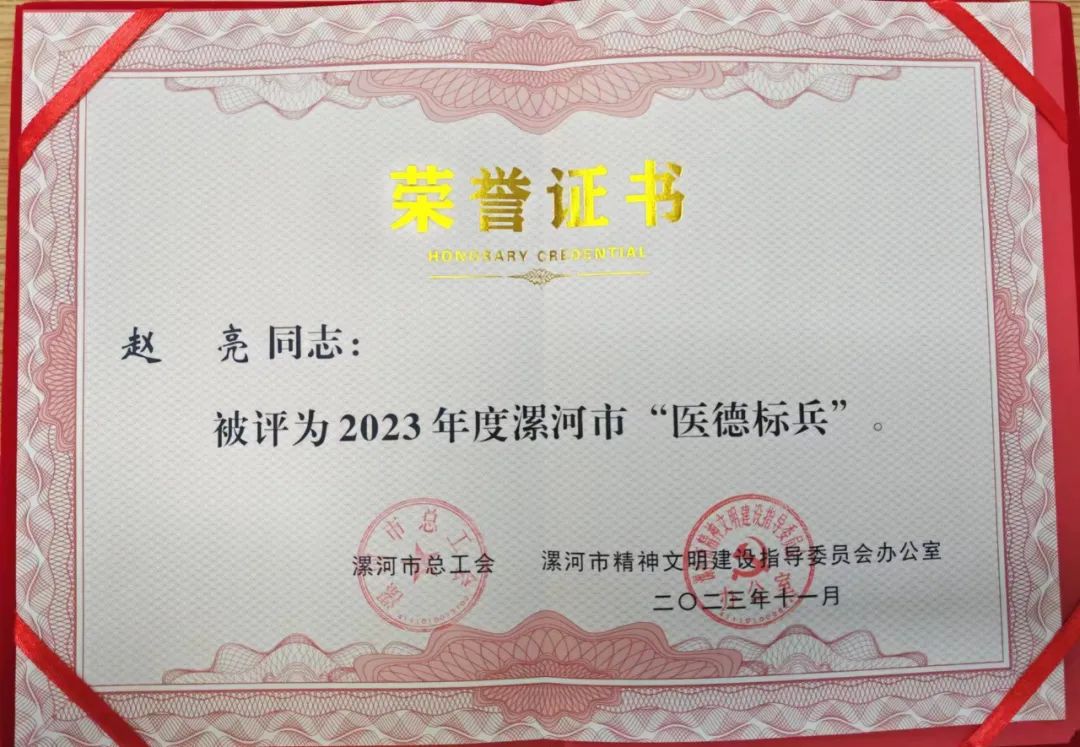 近年來,趙亮先后榮獲“漯河市五一勞動獎?wù)?rdquo;“漯河市職工職業(yè)道德建設(shè)十佳職工”“漯河市青年崗位能手”“漯河市優(yōu)秀醫(yī)師”等榮譽(yù)。一直以來他以白求恩、林巧稚為榜樣,恪守職業(yè)道德,廉潔自律,文明行醫(yī),全心全意為患者提供優(yōu)質(zhì)服務(wù),深受廣大患者尊敬和好評。
