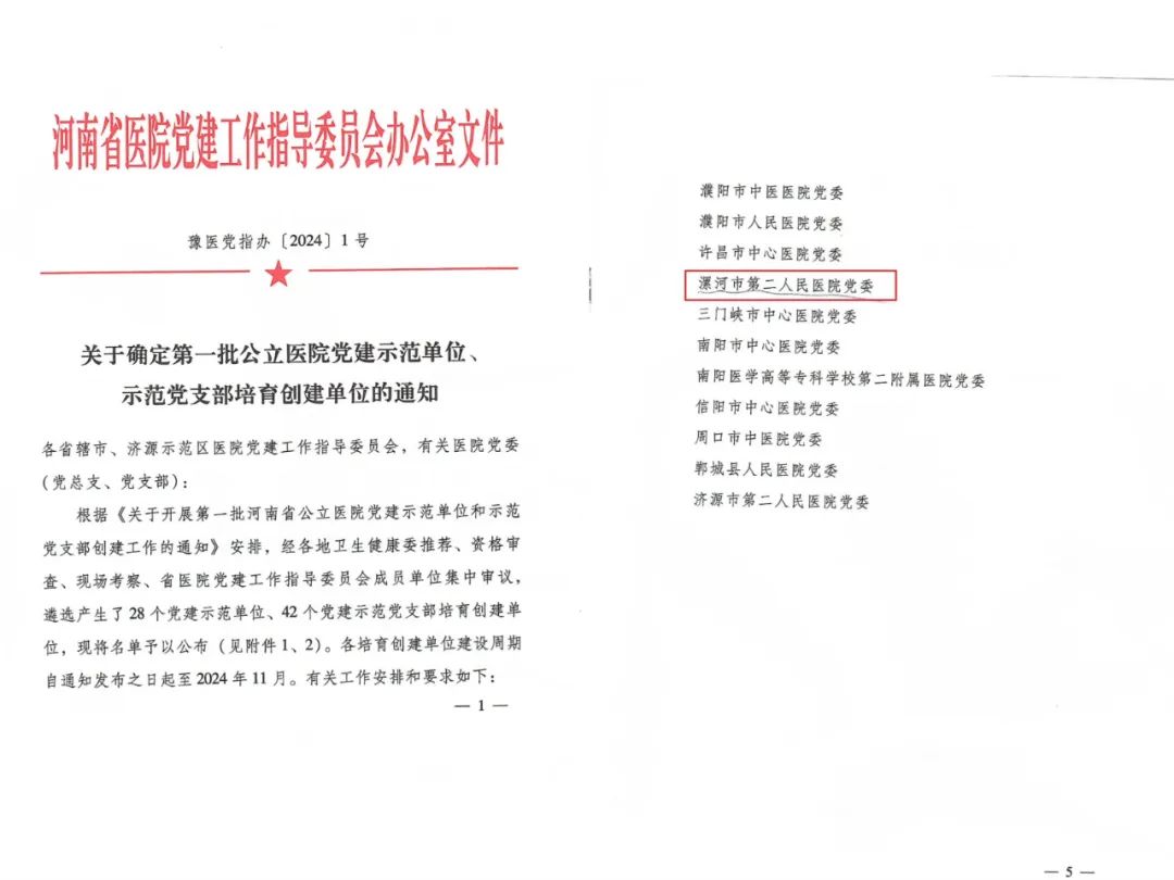 近日,河南省醫(yī)院黨建工作指導委員會下發(fā)《關于確定第一批公立醫(yī)院黨建示范單位、示范黨支部培育創(chuàng)建單位的通知》,市二院黨委被確定為河南省公立醫(yī)院黨建示范單位(培育創(chuàng)建單位),是全省28個黨建示范單位之一、漯河地區(qū)唯一。