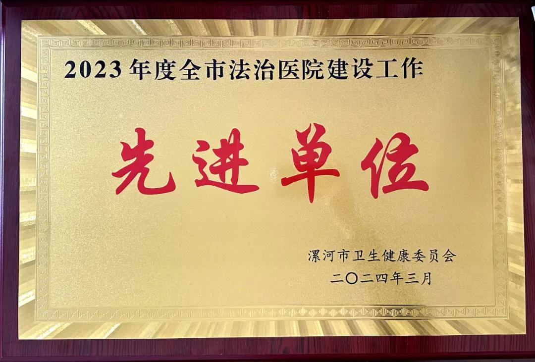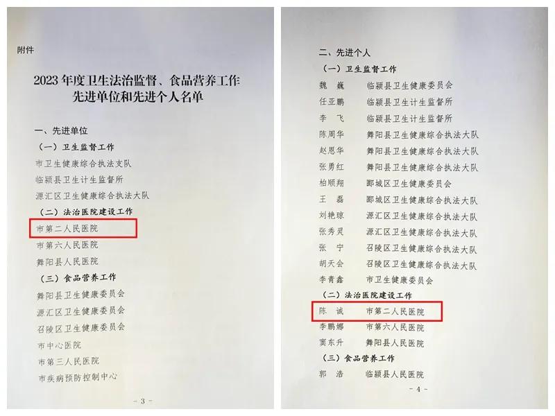 在3月20日召開的2024年度全市疾病預(yù)防控制、衛(wèi)生法治監(jiān)督暨食品營養(yǎng)工作會(huì)議上,市二院榮獲2023年度全市法治醫(yī)院建設(shè)工作先進(jìn)單位,陳誠榮獲全市法治醫(yī)院建設(shè)工作先進(jìn)個(gè)人。