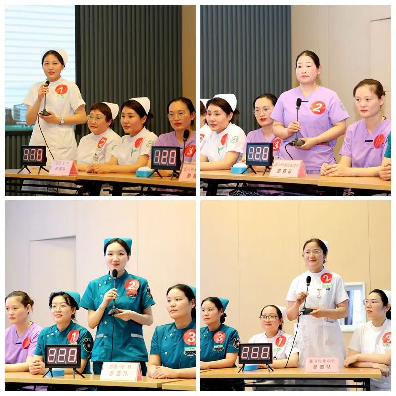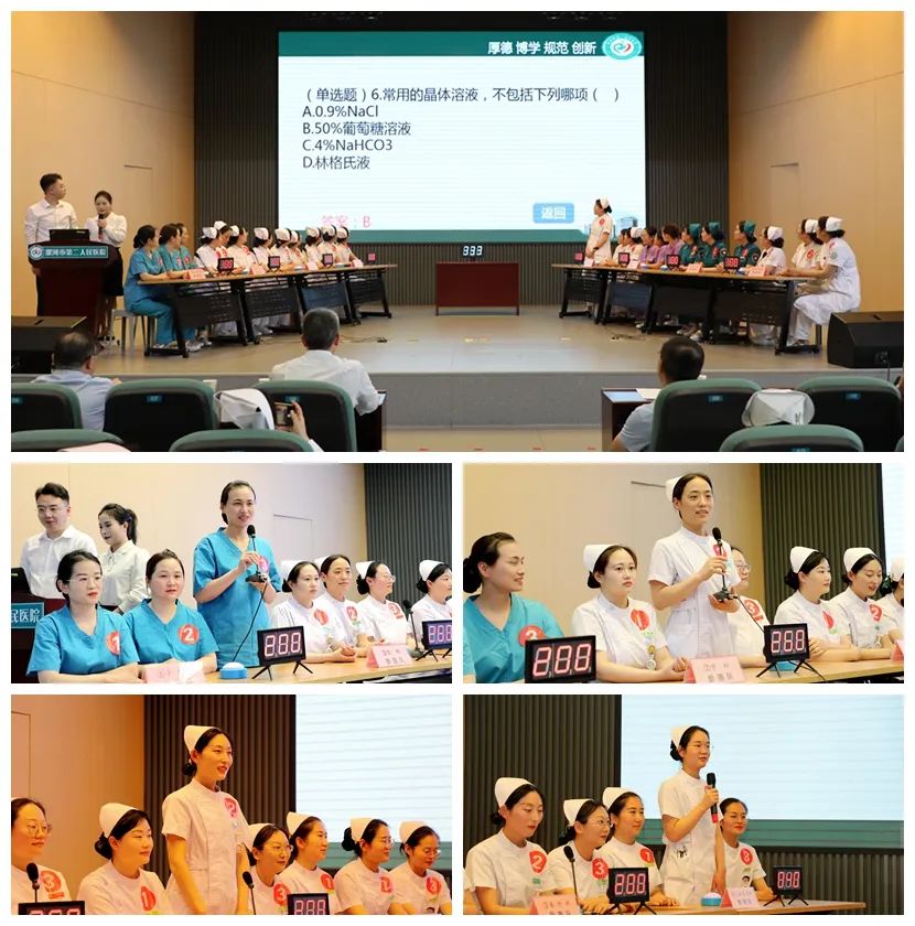 此次競賽內(nèi)容涵蓋基礎(chǔ)護理、??谱o理、護理團體標準、核心制度、應急預案等專業(yè)知識,分為初賽和決賽。此次活動,共有25個護理單元75名選手參加,經(jīng)過前期的層層選拔,8支代表隊24名選手參加了決賽。比賽現(xiàn)場氣氛火熱,高潮迭起,必答題環(huán)節(jié)各隊選手平分秋色,比分不相上下,隨著搶答環(huán)節(jié)的到來,比賽進入白熱化狀態(tài),各隊選手快速思考,競相搶答,上演了一場精彩紛呈的腦力與速度的較量;在風險題環(huán)節(jié),各隊選手不甘落后,幾乎是在題目出現(xiàn)的瞬間就已經(jīng)有人按下了搶答器并給出準確的答案,體現(xiàn)他們扎實的理論知識和深厚的實踐功底。