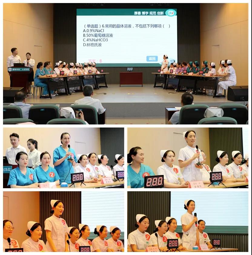 此次競賽內容涵蓋基礎護理、專科護理、護理團體標準、核心制度、應急預案等專業(yè)知識,分為初賽和決賽。此次活動,共有25個護理單元75名選手參加,經(jīng)過前期的層層選拔,8支代表隊24名選手參加了決賽。比賽現(xiàn)場氣氛火熱,高潮迭起,必答題環(huán)節(jié)各隊選手平分秋色,比分不相上下,隨著搶答環(huán)節(jié)的到來,比賽進入白熱化狀態(tài),各隊選手快速思考,競相搶答,上演了一場精彩紛呈的腦力與速度的較量;在風險題環(huán)節(jié),各隊選手不甘落后,幾乎是在題目出現(xiàn)的瞬間就已經(jīng)有人按下了搶答器并給出準確的答案,體現(xiàn)他們扎實的理論知識和深厚的實踐功底。