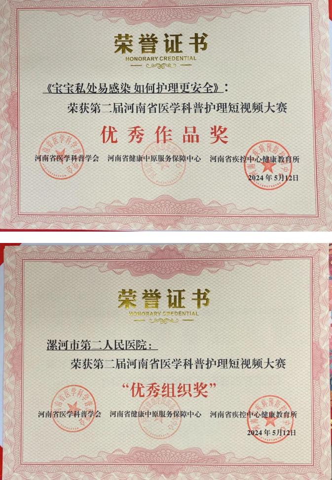 為慶祝113個(gè)國際護(hù)士節(jié),展示護(hù)理工作者的美好職業(yè)形象,引導(dǎo)公眾樹立正確的心理健康理念,5月8日,由河南省衛(wèi)生健康委宣傳處指導(dǎo),河南省醫(yī)學(xué)科普學(xué)會(huì)、河南省健康中原服務(wù)保障中心及河南省疾病預(yù)防控制中心健康教育所主辦的“第二屆河南省醫(yī)學(xué)科普護(hù)理短視頻大賽”在鄭州落下帷幕。本次比賽,市二院黨委高度重視,號(hào)召全院職工積極參與,征集優(yōu)秀護(hù)理科普短視頻,經(jīng)過積極籌備,廣泛動(dòng)員,共提交25部作品參賽。通過層層選拔,由張小玉、盧清麗、劉橋、王倩、陳星、劉曉燕護(hù)理團(tuán)隊(duì)拍攝的科普視頻《寶寶私處易感染 如何護(hù)理更安全》從全省18個(gè)地市442家醫(yī)療機(jī)構(gòu)2691部科普短視頻作品中脫穎而出,在本次大賽中榮獲優(yōu)秀獎(jiǎng)!同時(shí)醫(yī)院榮獲“優(yōu)秀組織獎(jiǎng)”!