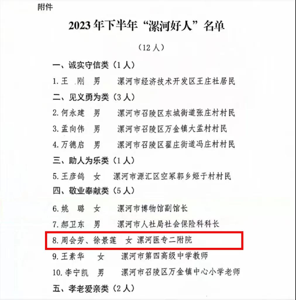 其中,來(lái)自漯河市骨科醫(yī)院(漯河醫(yī)專二附院、漯河市立醫(yī)院)的周會(huì)芳、徐景蓮光榮入選2023年下半年“漯河好人榜”!