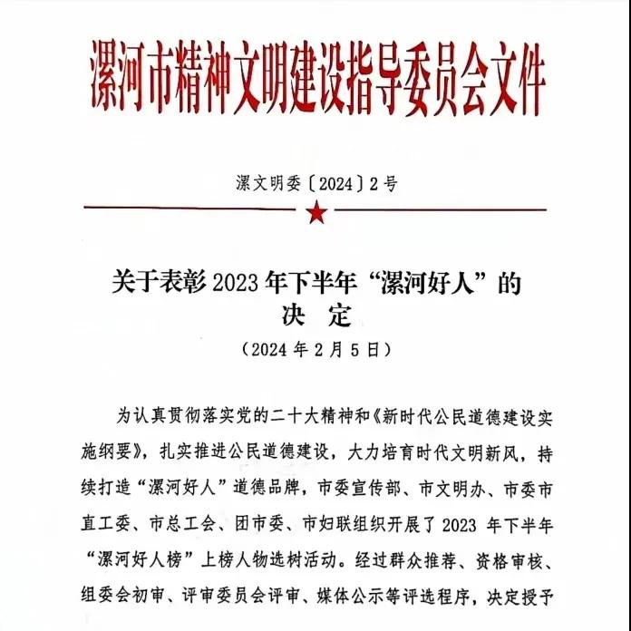 為認(rèn)真貫徹落實(shí)黨的二十大精神和《新時(shí)代公民道德建設(shè)實(shí)施綱要》,扎實(shí)推進(jìn)公民道德建設(shè),大力培育時(shí)代文明新風(fēng),持續(xù)打造“漯河好人”道德品牌,市委宣傳部、市文明辦、市委市直工委、市總工會(huì)、團(tuán)市委、市婦聯(lián)組織開(kāi)展了2023年下半年“漯河好人榜”上榜人物選樹(shù)活動(dòng)。經(jīng)過(guò)群眾推薦、資格審核、組委會(huì)初審、評(píng)審委員會(huì)評(píng)審、媒體公示等評(píng)選程序,共12人上榜。
