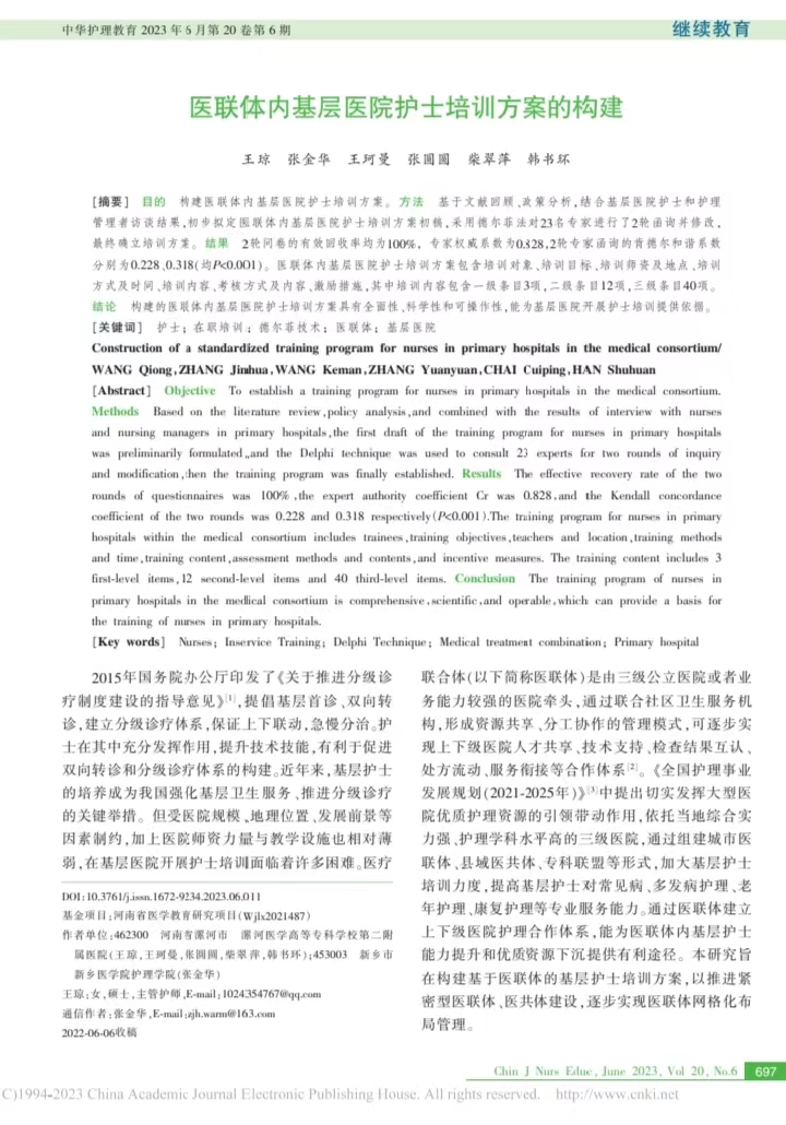 漯河醫(yī)專二附院(漯河市骨科醫(yī)院、漯河市立醫(yī)院)作為國家三級綜合醫(yī)院,高度重視醫(yī)聯(lián)體建設,自2019年成立醫(yī)聯(lián)體組織以來,作為牽頭單位已簽署了30余家成員單位,近年來不斷探索基層醫(yī)院護士來院培訓學習方案,2021年我院申報獲批河南省醫(yī)學教育研究項目1項,項目名稱為“區(qū)域醫(yī)療聯(lián)合體內(nèi)基層醫(yī)院護士規(guī)范化培訓管理模式的構(gòu)建”,項目團隊成員經(jīng)過文獻檢索、調(diào)查研究、專家函詢等形式構(gòu)建了“基于醫(yī)聯(lián)體的基層醫(yī)院護士培訓方案”,該培訓方案具有可信性、可行性和可操作性,內(nèi)容全面,有助于提高基層護士專業(yè)服務能力的提升,被中文核心期刊中華護理教育雜志錄用并發(fā)表。