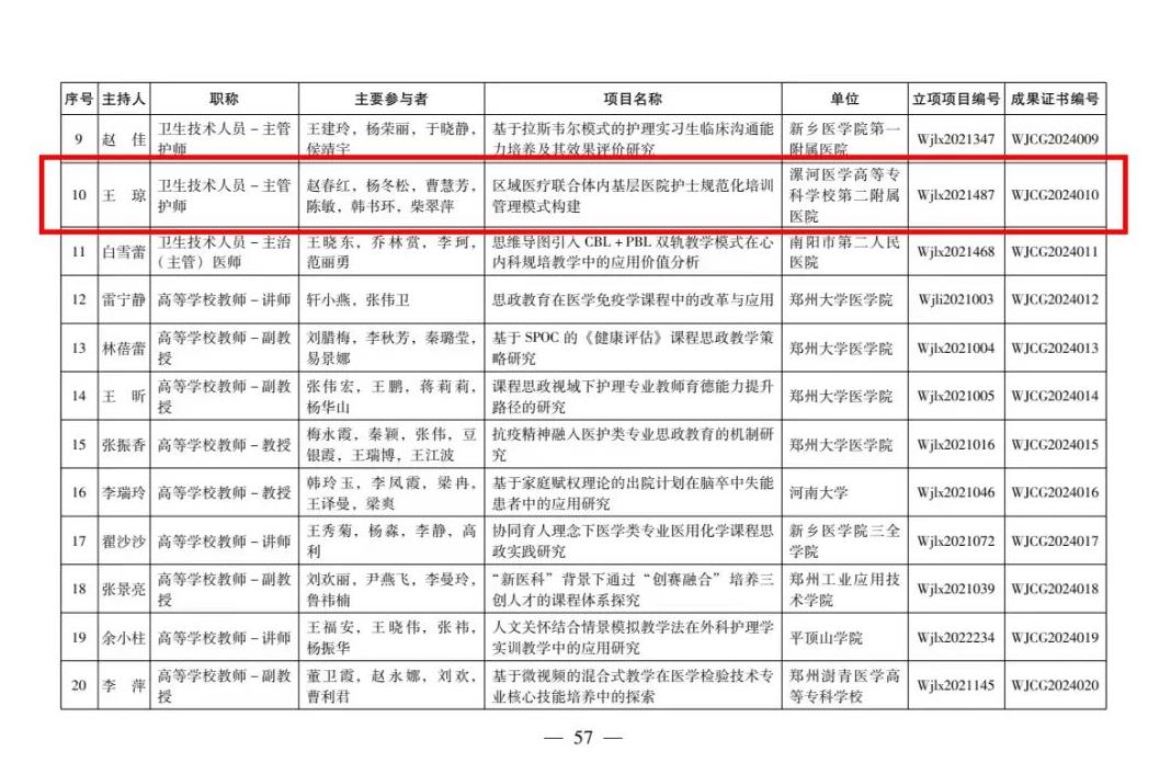 近日,河南省衛(wèi)生健康委員會下發(fā)了《關于公布2024年河南省醫(yī)學教育研究項目立項教學成果和優(yōu)質(zhì)課評選結(jié)果的通知》,由漯河市骨科醫(yī)院(漯河醫(yī)專二附院、漯河市立醫(yī)院)王瓊、趙春紅、楊冬松、曹慧芳、陳敏、韓書環(huán)、柴翠萍團隊完成的《區(qū)域醫(yī)療聯(lián)合體內(nèi)基層醫(yī)院護士規(guī)范化培訓管理模式構(gòu)建》項目完成結(jié)項,被授予2024年河南省醫(yī)學教育優(yōu)秀教學成果一等獎。