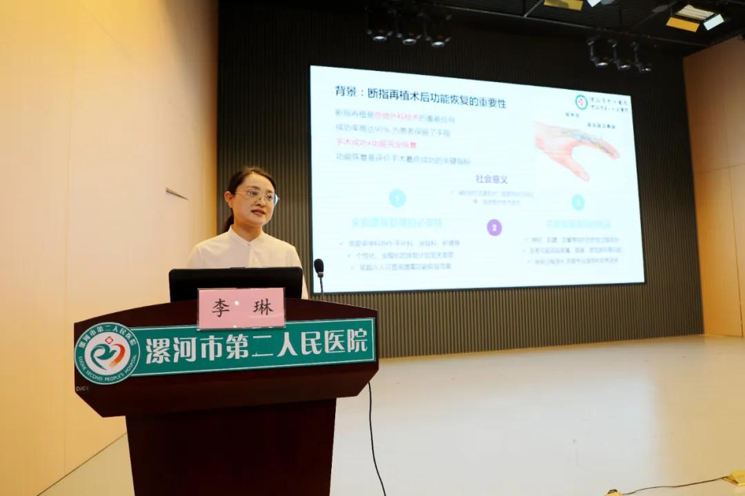 學術(shù)交流會上,市中心醫(yī)院創(chuàng)傷骨科外科護理規(guī)培基地秘書李琳講解了《全程康復護理管理模式在斷指再植患者術(shù)后功能恢復中的應(yīng)用》,分享醫(yī)院的全程康復護理管理模式,實現(xiàn)了從術(shù)前準備到長期隨訪的全程管理,提高了康復治療的標準性和個體化水平。