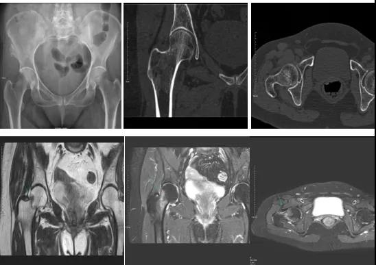 DR示:右側(cè)股骨頸未見明顯骨折征象。CT右側(cè)股骨頸骨質(zhì)密度不均?;颊唧w征明顯,為明確診斷,行MRI檢查。MRI示:右側(cè)股骨頸T1WI呈低信號(hào),脂肪抑制序列呈高信號(hào);提示右側(cè)股骨頸隱匿性骨折。