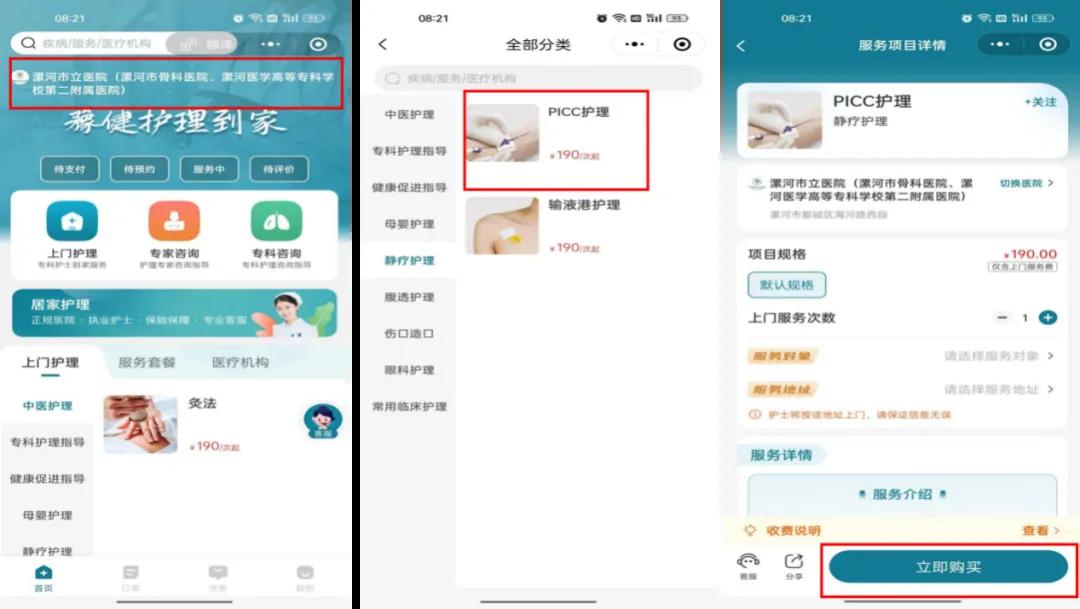 2.進(jìn)入后查看醫(yī)院是否正確,以下內(nèi)容以PICC護(hù)理為例:選擇PICC護(hù)理,點(diǎn)擊立即購買。