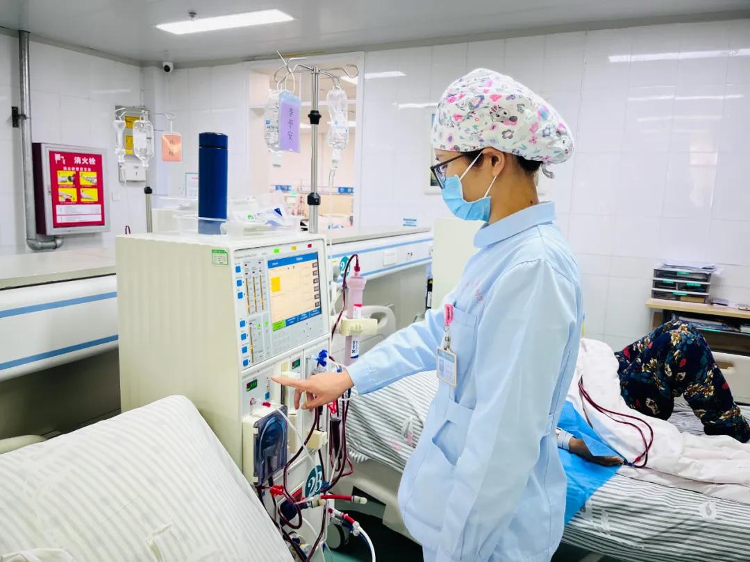 血液凈化室是一個安靜的地方。透析機(jī)發(fā)出的“嘀嗒”聲和患者的呼吸聲成為這里獨(dú)特的旋律。每天早上7點(diǎn),我會準(zhǔn)時到崗,檢查機(jī)器、配制抗凝劑等,做好患者上機(jī)前的準(zhǔn)備工作;透析過程中,認(rèn)真監(jiān)測患者生命體征……對每一個步驟都嚴(yán)謹(jǐn)細(xì)致。在這個沒有硝煙的戰(zhàn)場上,我時刻保持警惕,為患者健康盡心盡力。
