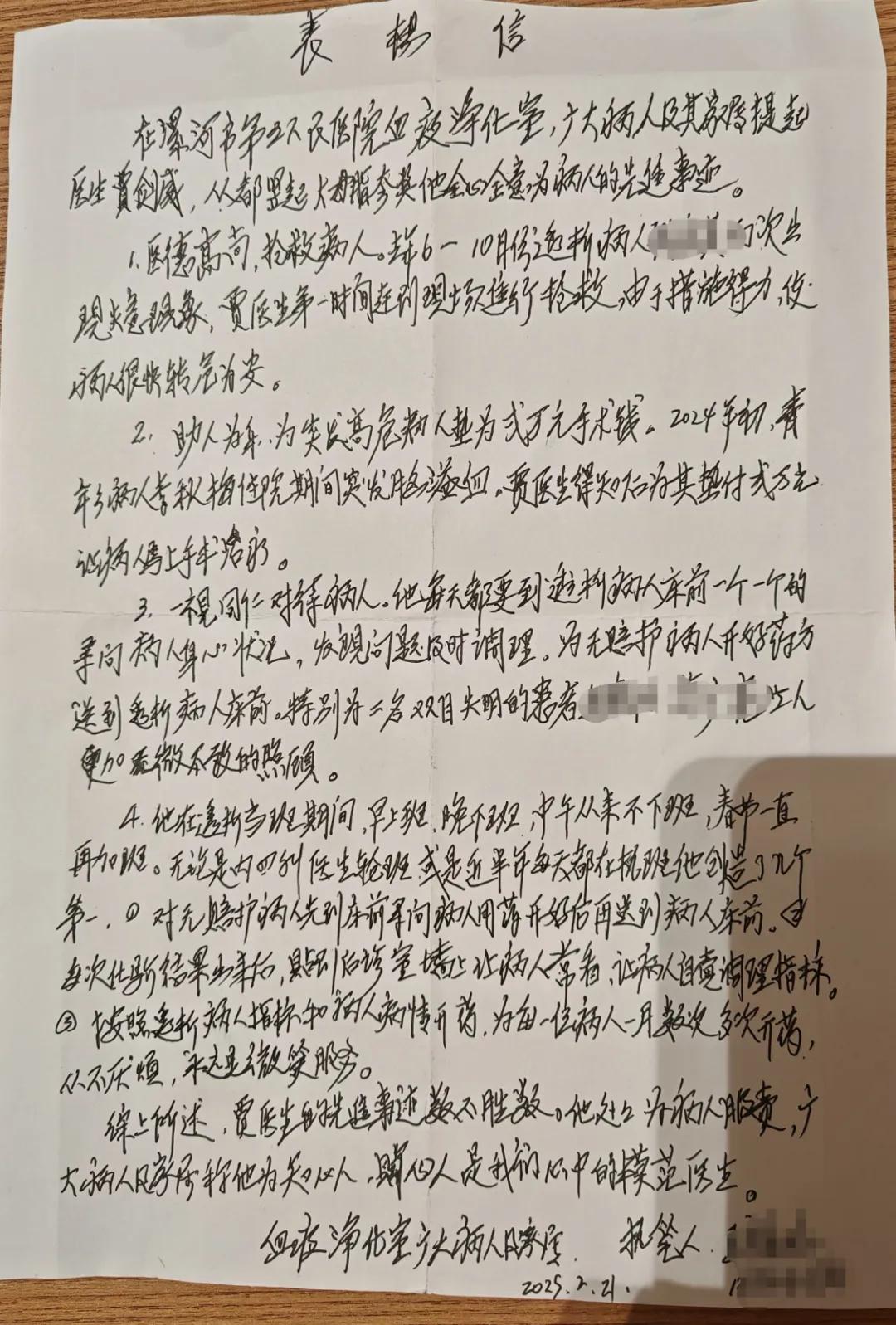 “他處處為病人服務(wù),廣大病人及家屬稱他為知心人、貼心人,是我們心中的模范醫(yī)生......”信箋上,溫暖的字句自然流淌,言語(yǔ)間都是對(duì)賈劍威醫(yī)生的信任與感激。