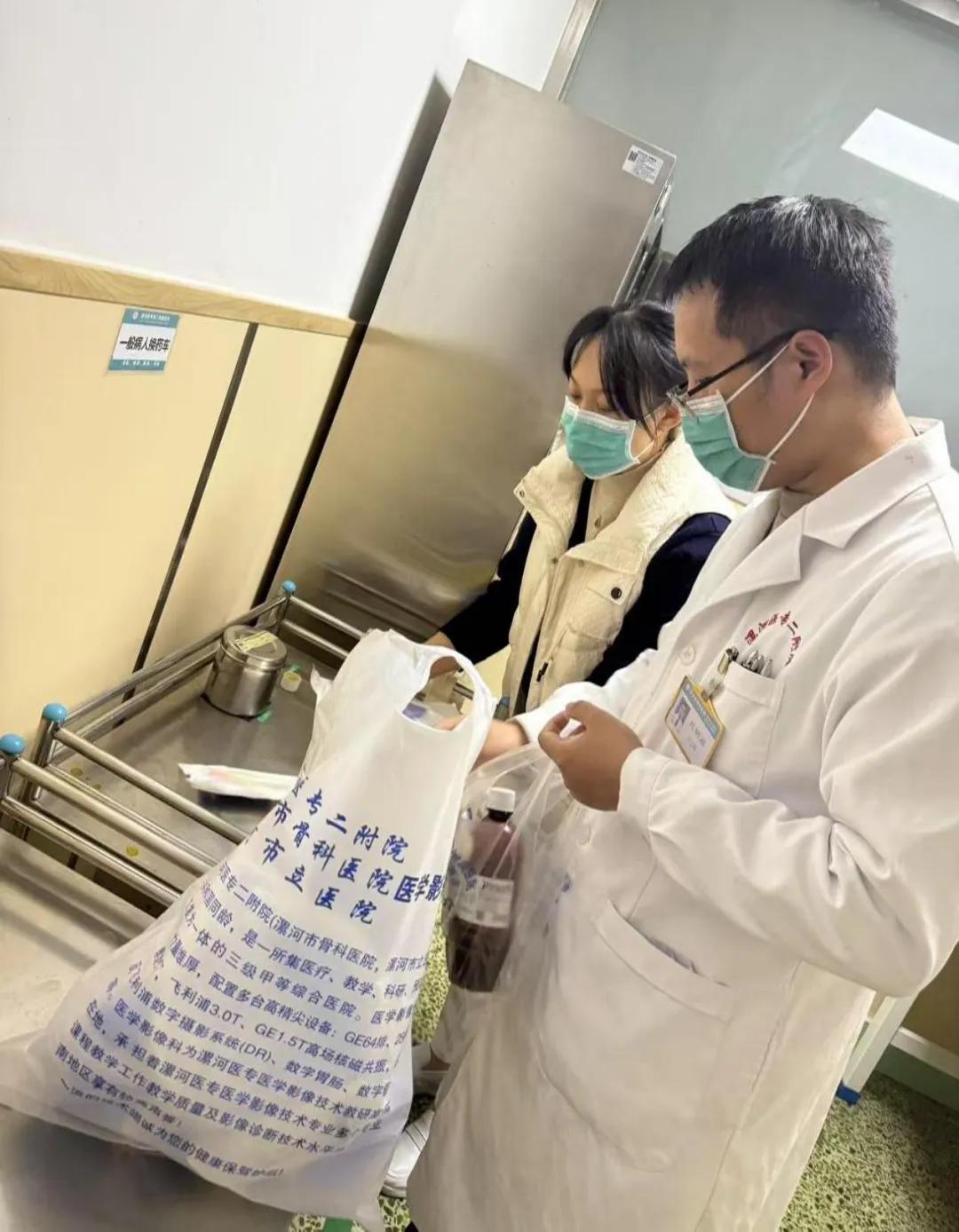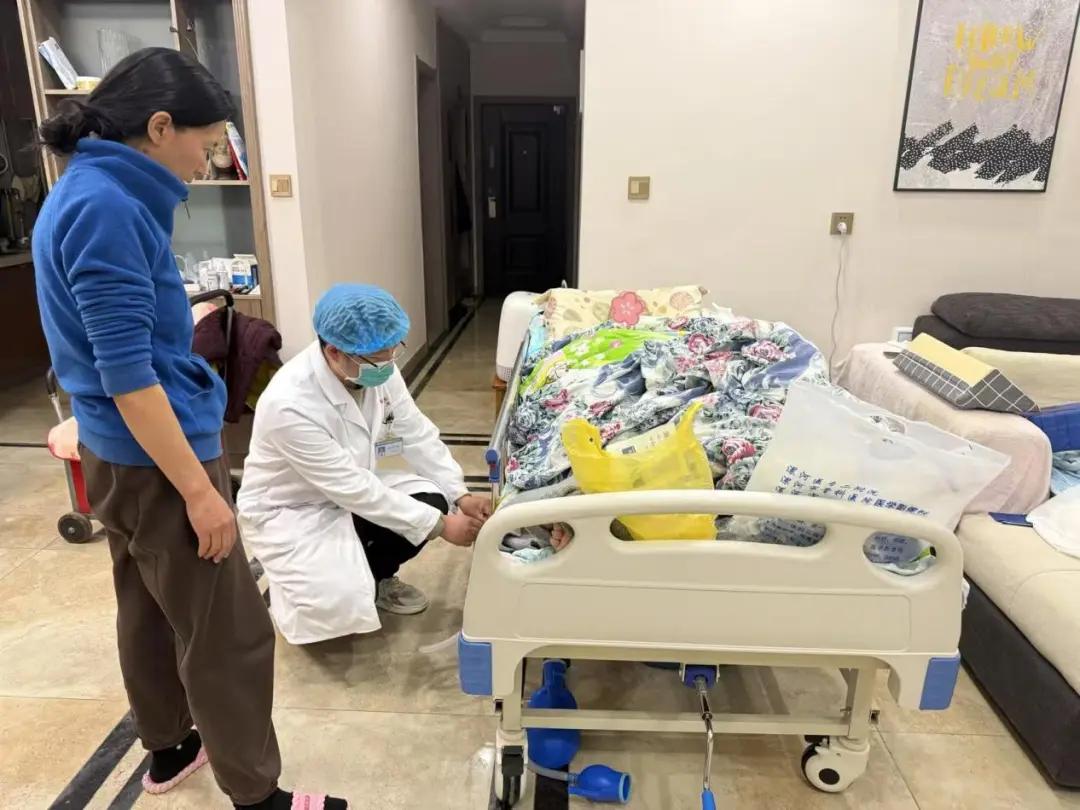 陳笑寒耐心地安撫家屬的情緒,同時迅速指導他們在豫健護理到家平臺上進行下單。訂單一經(jīng)接收,在閆衛(wèi)甫主任的全力支持下,她與醫(yī)生劉明啟迅速響應,僅用數(shù)分鐘便仔細核對并打包了所有必需品。盡管一天的勞累尚未消散,他們還是不顧疲憊,迎著暮色急忙趕往患者家中。