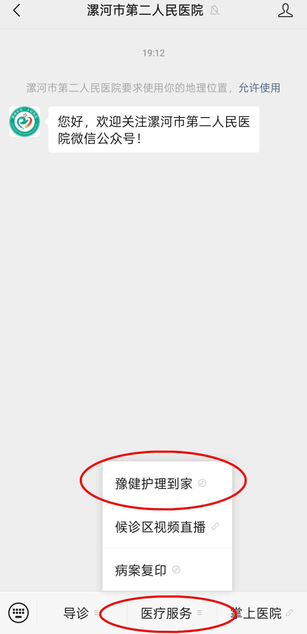 方法一:微信搜索“漯河市第二人民醫(yī)院”公眾號進(jìn)入主頁面,關(guān)注服務(wù)號之后,點擊醫(yī)療服務(wù)→豫健護(hù)理到家項目。