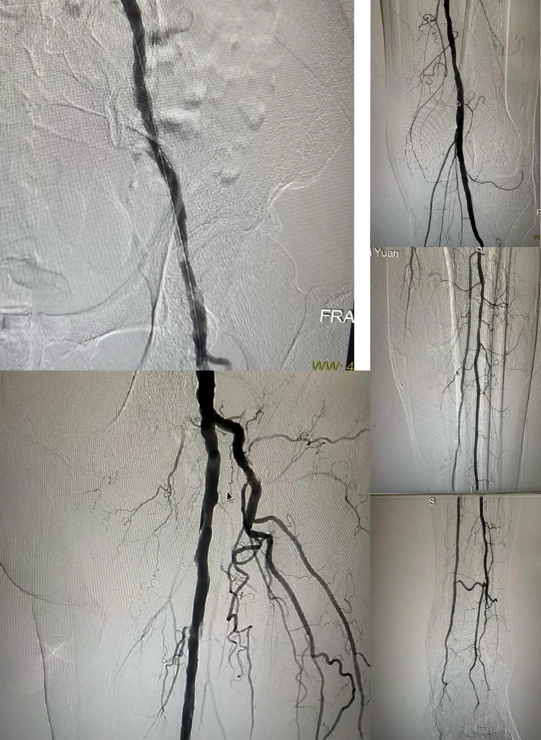 患者,男,73歲,約15天前出現(xiàn)左側(cè)腳面腫痛,間歇性跛行,左足第三足趾壞疽,遂來市中醫(yī)院就診,以“下肢動(dòng)脈硬化閉塞、糖尿病足壞疽、”收住外二科,評(píng)估患者病情后需實(shí)施左下肢球囊擴(kuò)張成形術(shù)。術(shù)中造影見患者左側(cè)髂動(dòng)脈、股淺動(dòng)脈階段性重度狹窄。經(jīng)外周球囊擴(kuò)張術(shù)后,再次造影見股淺動(dòng)脈、髂動(dòng)脈血流通暢,膝下及足部血流速度較前改善。