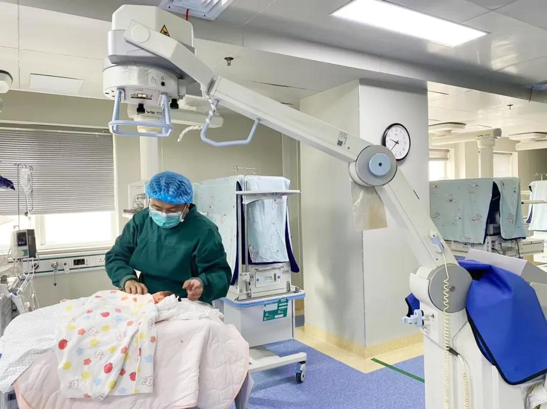 接到通知后,放射科楊會磊、王斌兩位醫(yī)生隨即攜帶移動DR機趕到新生兒重癥監(jiān)護室,行胸片發(fā)現(xiàn)右肺被氣體壓縮90%(考慮張力性氣胸),需緊急救治。一場緊張有序的生命接力賽開始了……
