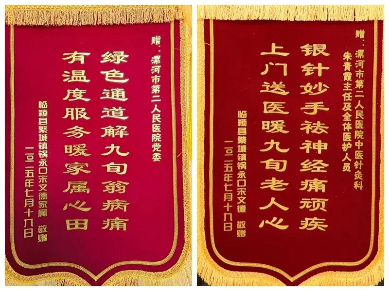 7月20日上午,市二院門診大廳暖意融融,92歲宋老先生的家屬手捧兩面錦旗,專程向醫(yī)院黨委和中醫(yī)針灸科表達(dá)最誠摯的謝意。副院長劉橋受院黨委委托與全國先進(jìn)工作者、全國“五一”勞動獎?wù)芦@得者、中醫(yī)針灸科主任朱青霞及科室團(tuán)隊(duì)熱情接待了家屬,并鄭重接過了這份沉甸甸的心意。