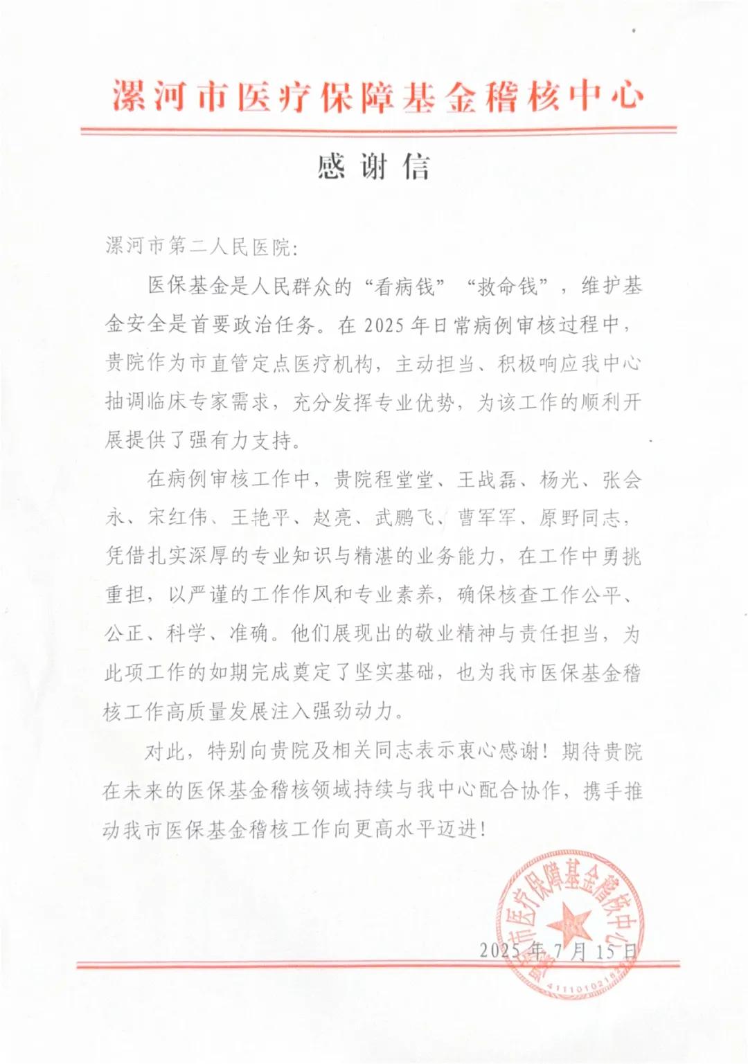 近日,市醫(yī)療保障基金稽核中心向市二院發(fā)來感謝信,對醫(yī)院選派多名業(yè)務(wù)骨干協(xié)助開展2025年日常病例審核工作表示感謝,信中高度評價市二院專家團(tuán)隊以扎實的臨床功底和嚴(yán)謹(jǐn)?shù)墓ぷ髯黠L(fēng),高效完成病例合規(guī)性審查,為醫(yī)?;鸨O(jiān)管提供重要技術(shù)支持,并對醫(yī)院長期以來在醫(yī)保政策落實、醫(yī)療質(zhì)量管控方面的工作成效給予充分肯定。