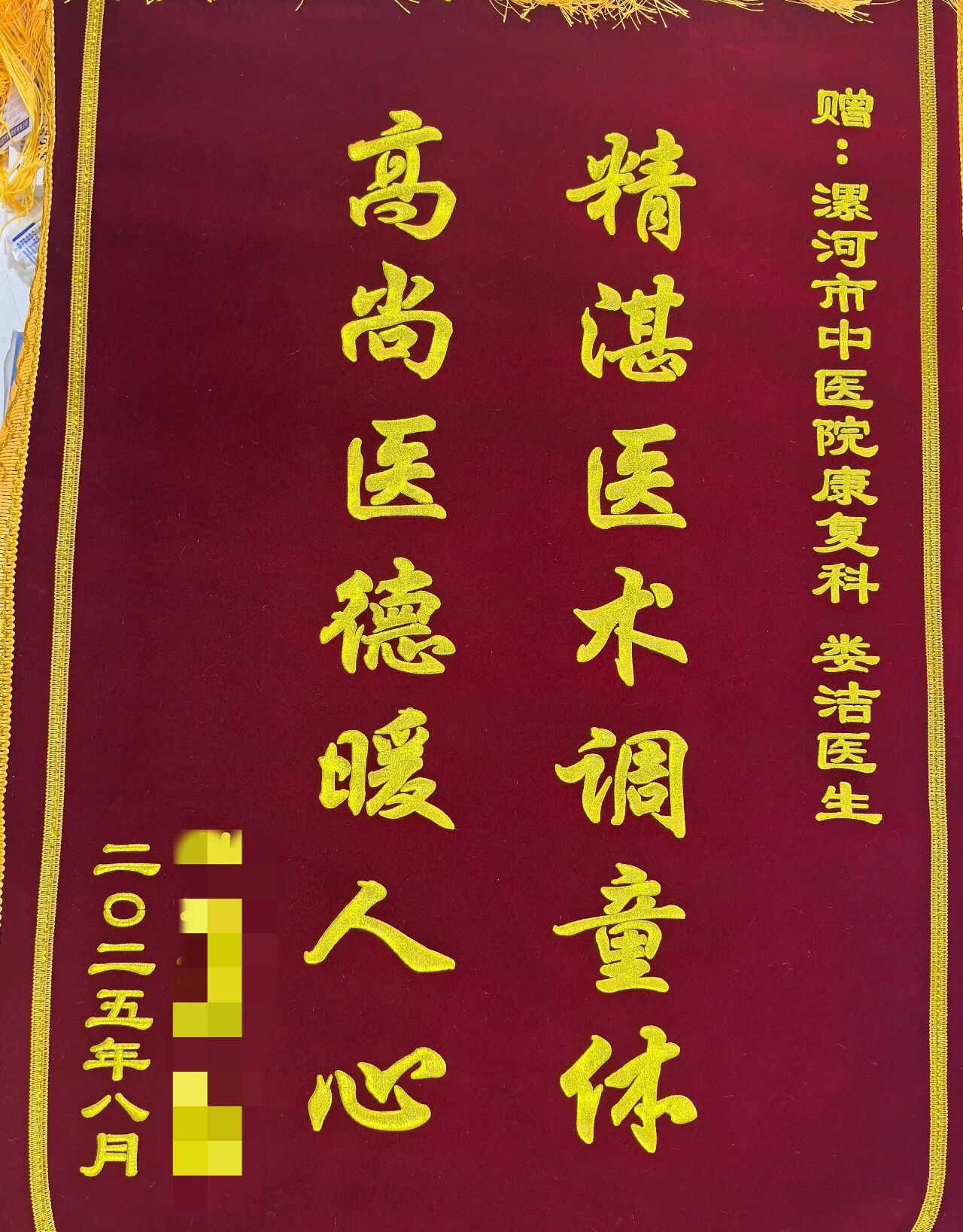 近日,漯河市中醫(yī)院兒童康復(fù)科收到患兒家屬贈(zèng)送的兩面錦旗,分別寫有 “杏林飄香贊醫(yī)德,仁心仁術(shù)好醫(yī)生”“精湛醫(yī)囑調(diào)童體,高尚醫(yī)德暖人心”。家屬以此表達(dá)對(duì)婁潔醫(yī)生、王莉護(hù)士長(zhǎng)及治療師精湛技術(shù)和優(yōu)質(zhì)服務(wù)的肯定與感謝。