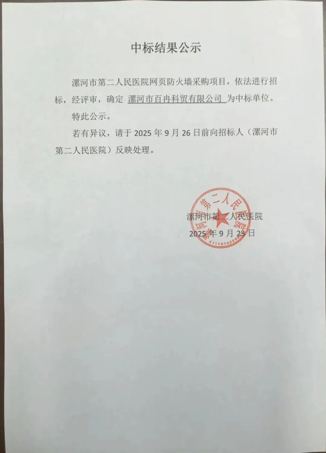 漯河市第二人民醫(yī)院:項目中標(biāo)公示