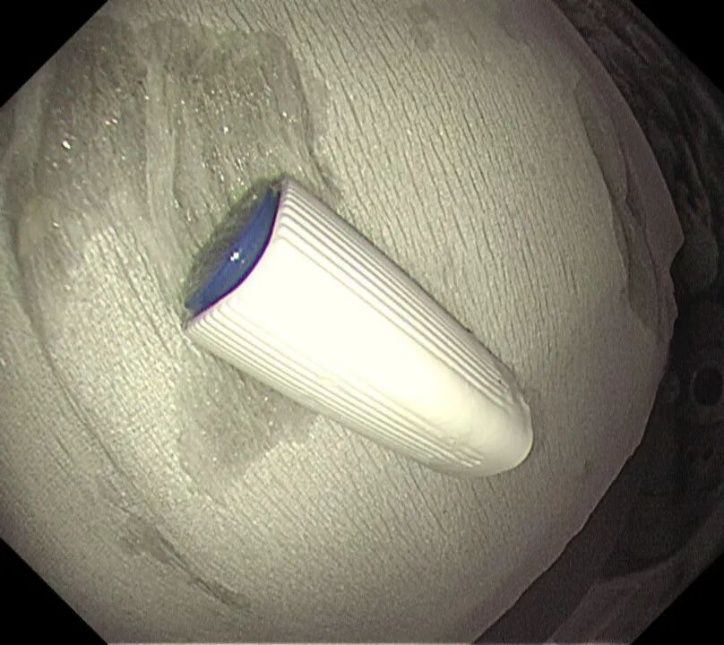 時間不等人,雖已臨近晚7點(diǎn),市二院第一時間啟動應(yīng)急響應(yīng)機(jī)制,內(nèi)鏡室、麻醉科醫(yī)護(hù)技立即返崗就位,并經(jīng)院辦等職能部門積極協(xié)調(diào),盡可能縮短術(shù)前準(zhǔn)備時間,迅速制定了取出異物的方案。隨后,在全身麻醉下,朗朗安然入睡,醫(yī)生通過纖細(xì)的胃鏡,精準(zhǔn)地找到了那個“惹事”的筆帽位于十二指腸內(nèi),并順利將其取出。整個過程僅用時十幾分鐘,朗朗術(shù)后很快蘇醒,觀察無礙后平安回家。