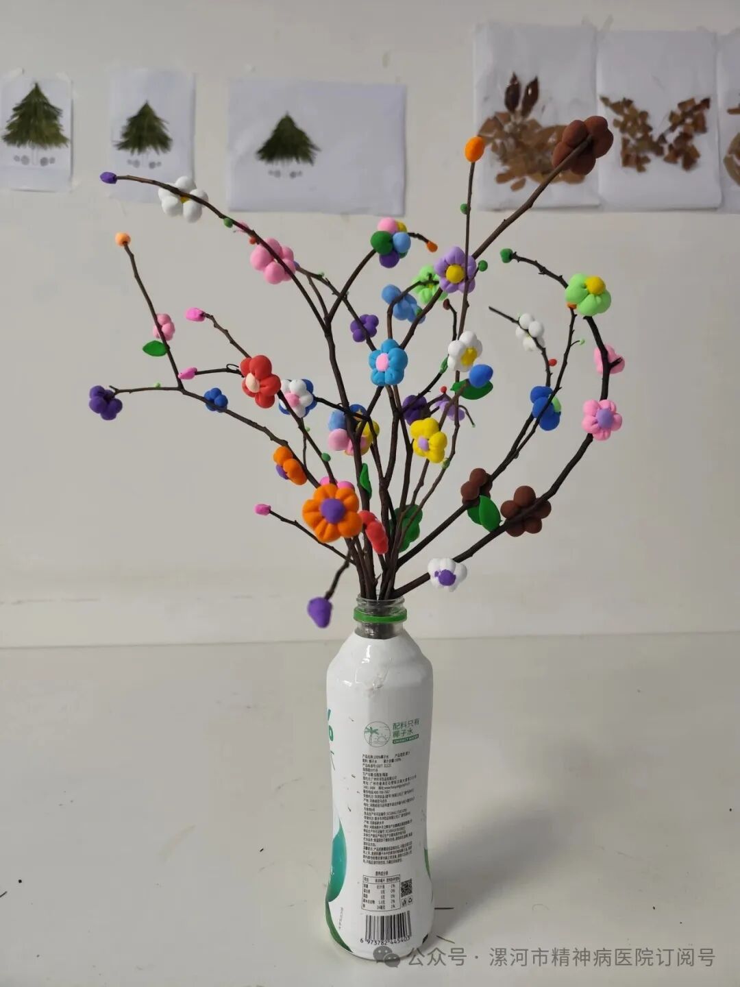 12月1日,漯河市精神病醫(yī)院心身醫(yī)學(xué)科的活動(dòng)室,有點(diǎn)不一樣,沒有復(fù)雜的工具,只有幾包彩色粘土、撿來的枯樹枝,還有一群帶著期待的患者。醫(yī)護(hù)人員要做的,是把“春天”捏進(jìn)枯枝里,裝在喝完的飲料瓶里~