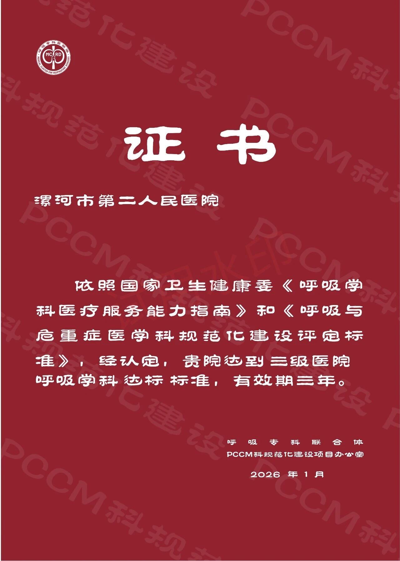 2026年1月10-11日,2026年中國呼吸學(xué)科發(fā)展大會在北京召開。會上,公布了2025年度呼吸與危重癥醫(yī)學(xué)科(PCCM)評審結(jié)果,漯河市第二人民醫(yī)院呼吸與危重癥醫(yī)學(xué)科達(dá)到三級醫(yī)院呼吸學(xué)科達(dá)標(biāo)標(biāo)準(zhǔn)。