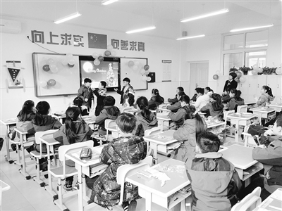 在教學(xué)樓二樓的三(1)班教室,記者看到教室內(nèi)被學(xué)生們用氣球裝扮起來,班里正在舉行活動(dòng)。3位同學(xué)正在教室前方表演自己編排的話劇,幽默的臺(tái)詞和滑稽的動(dòng)作,惹得班里的同學(xué)和老師哈哈大笑。