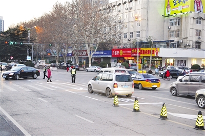 1月12日下午,在市區(qū)黃河路與黃山路交叉口,市交警支隊秩序管理示范大隊的工作人員正在東西方向的左轉(zhuǎn)車道前施劃交通標線。這些標線由白色虛線組成,長約18米,連到了馬路中間。隨后,工作人員在紅綠燈處設(shè)立配套指示標牌。