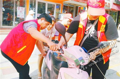 志愿者在馬路街對商戶落實(shí)“門前三包”情況進(jìn)行督導(dǎo),發(fā)現(xiàn)問題現(xiàn)場解決。 漯河日報全媒體記者 范子恒 攝