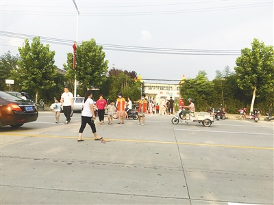 當(dāng)天下午,記者來(lái)到位于太行山路北段東側(cè)的孟廟鎮(zhèn)中心幼兒園門(mén)口。正值幼兒園放學(xué)時(shí)間,接送孩子的家長(zhǎng)較多,部分家長(zhǎng)把車輛停在了學(xué)校對(duì)面,接到孩子后需要穿過(guò)馬路回家。因?yàn)槁飞蠜](méi)有設(shè)置安全警示牌,也沒(méi)有減速帶、斑馬線等交通標(biāo)識(shí),家長(zhǎng)帶著孩子在車流中穿梭(如圖)。
