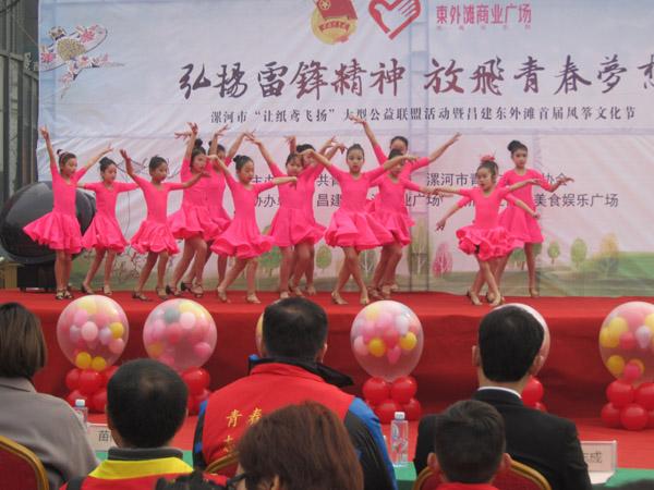 在啟動儀式上舉行“童心繪沙澧”主題活動,20多名留守兒童/殘疾兒童與青年志愿者共同在風箏上繪制沙澧美景,并一起放飛風箏;一個16的漯河小伙子用6個月時間,精心制作了長達33米的巨型大風箏,放飛在商業(yè)廣場的時空;中學生表演的舞蹈節(jié)目,美奐美倫,特別受到廣大志愿者和留守兒童/殘疾兒童們的歡迎。