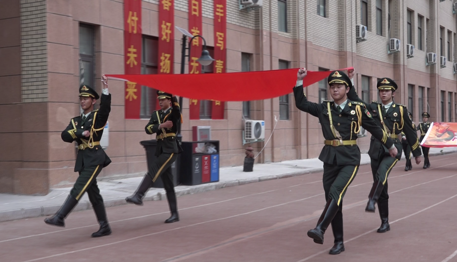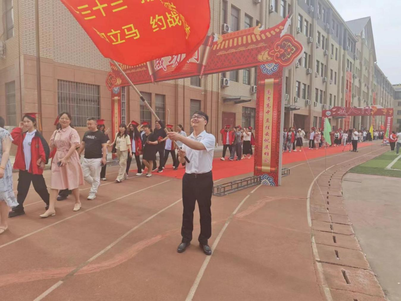 在雄壯激昂的國歌聲中,國旗班同學(xué)護送國旗緩緩入場,高三年級必勝旗緊隨其后。