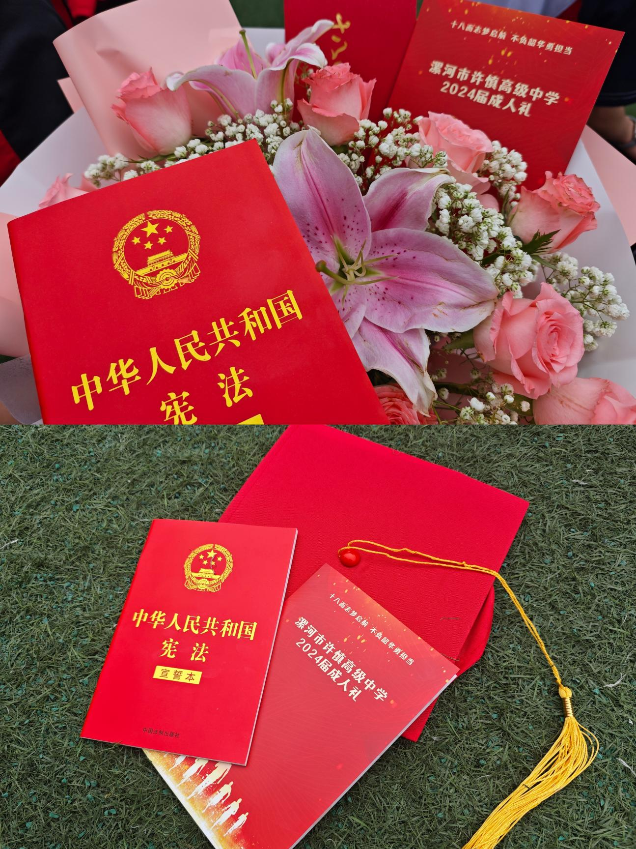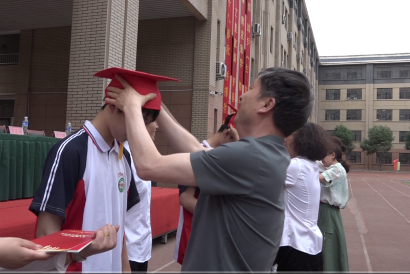 家長、老師為同學(xué)們戴成人帽,頒發(fā)成人證書。加冠笄,明責任,各位領(lǐng)導(dǎo)為學(xué)生代表撥動象征成年的帽穗,頒發(fā)《中華人民共和國憲法》讀本。同學(xué)們戴上象征成人的冠帽,手握《憲法》,展開對未來的美好憧憬與無限期盼。一頂頂成人禮帽,見證著每一位學(xué)子的長大成人。全體同學(xué)起立,和父母交換信件,向父母深深地鞠躬,一個個溫暖堅實的擁抱,一聲聲“爸、媽,我愛你”,讓在場的所有人為之動容,熱淚盈眶。