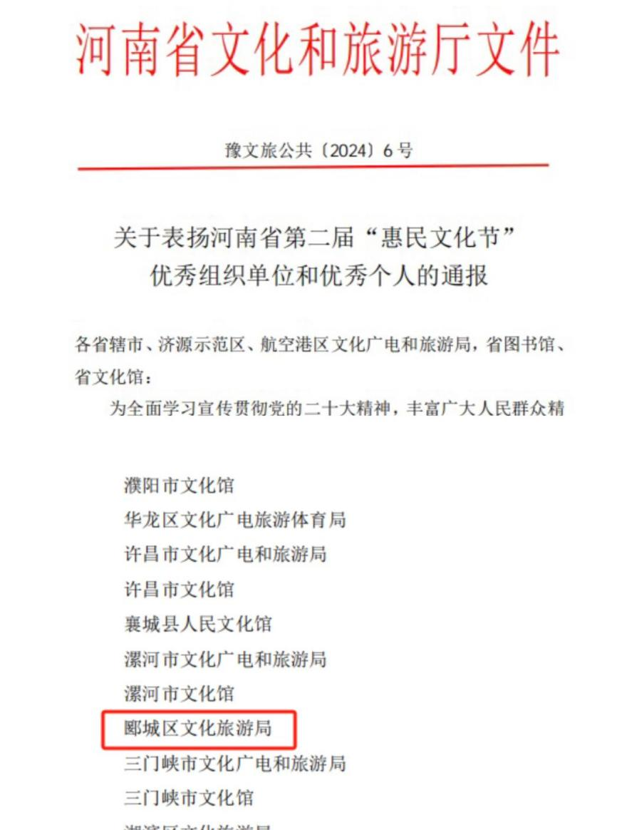 近期,在河南省文化和旅游廳公布的《關(guān)于表揚(yáng)河南省第二屆“惠民文化節(jié)”優(yōu)秀組織單位和優(yōu)秀個人的通報》中,郾城區(qū)文化旅游局獲優(yōu)秀組織獎,局黨組書記、局長李小青榮獲“優(yōu)秀個人”稱號,這既是對郾城區(qū)惠民文化工作的充分肯定和贊揚(yáng),更是對今后文化工作的鼓勵與鞭策。