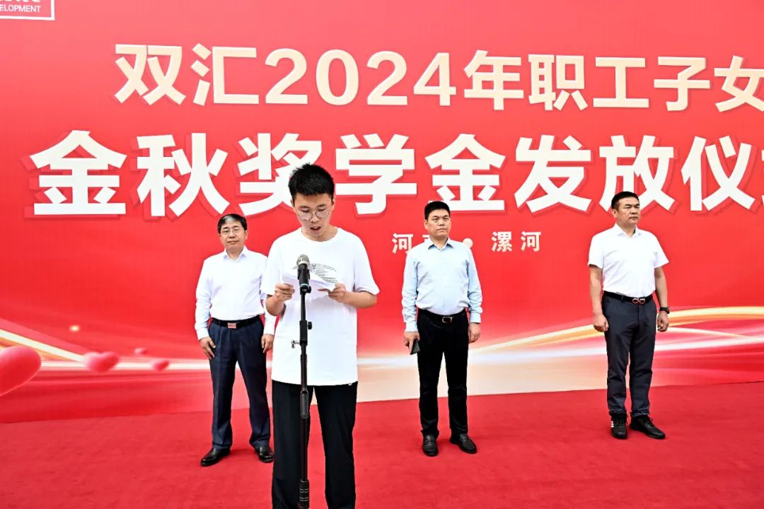 雙匯職工代表薛志良上臺(tái)發(fā)言,他表示,企業(yè)對(duì)職工子女的關(guān)心和支持,讓大家深感暖心,也倍受激勵(lì),并號(hào)召大家繼續(xù)發(fā)揚(yáng)“優(yōu)質(zhì)、高效、拼搏、創(chuàng)新”的企業(yè)精神,為企業(yè)的偉大征程蓄力添彩。