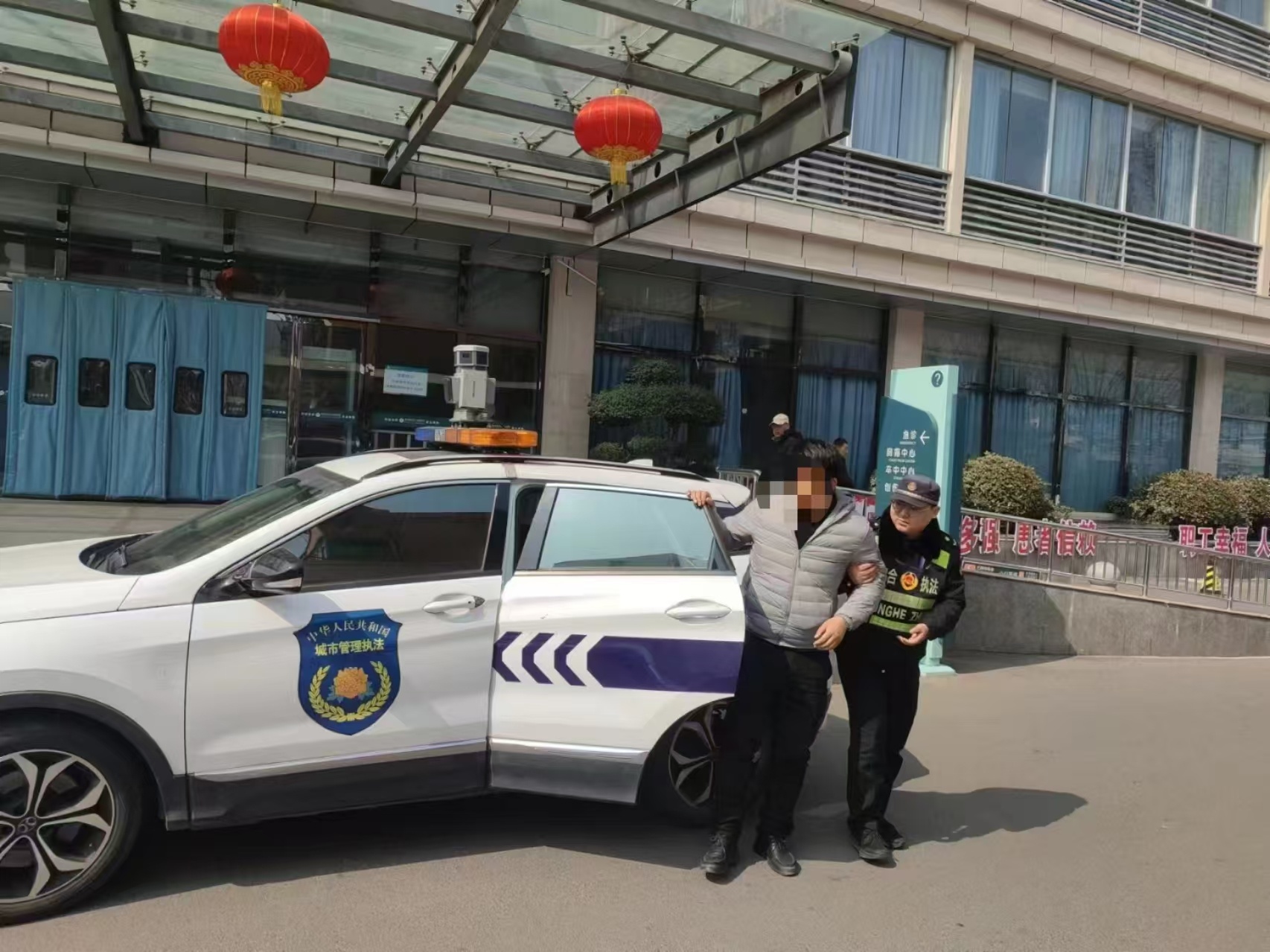 城管隊員護送受傷群眾到醫(yī)院治療 王航 攝