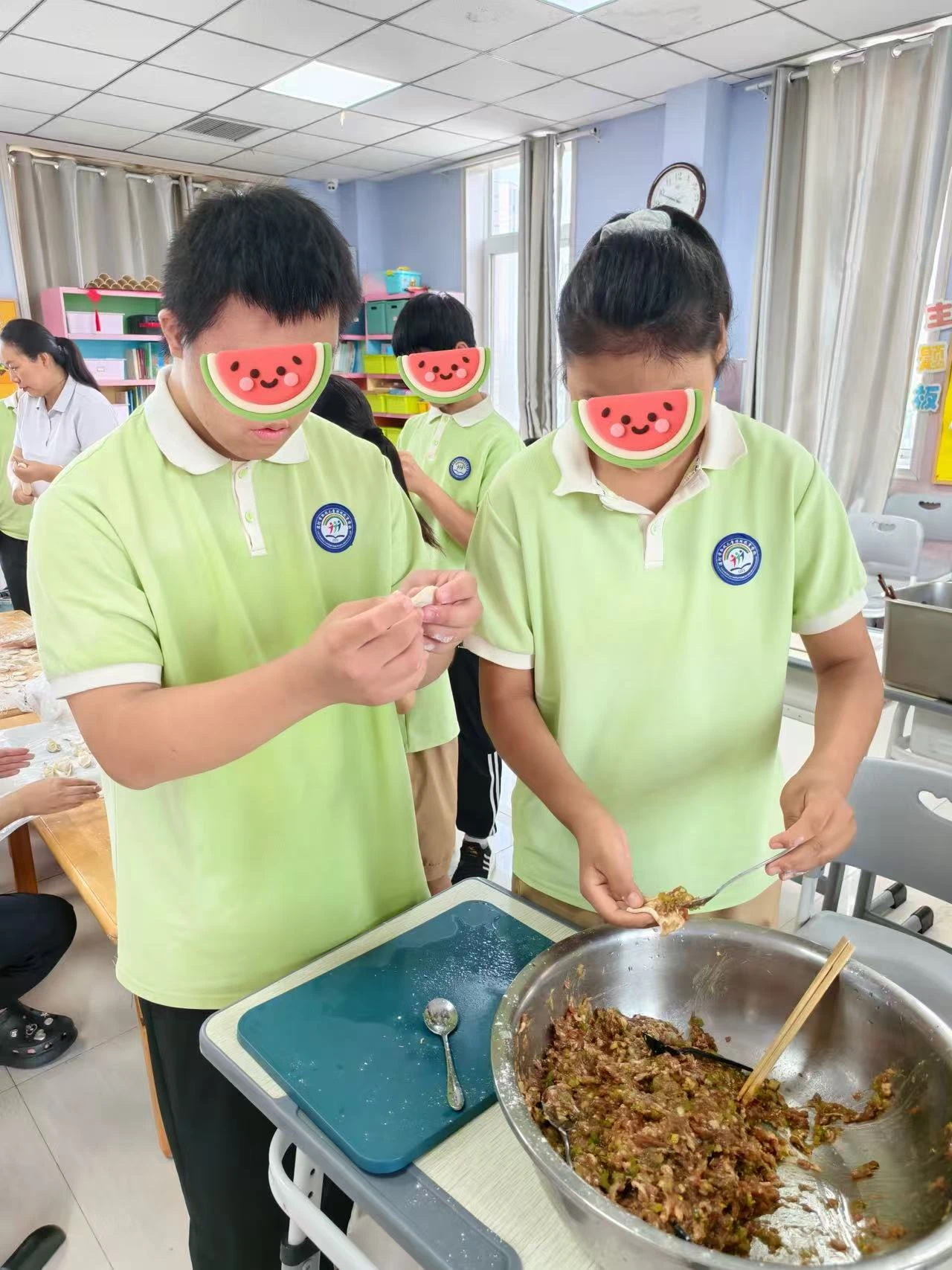 孩子們穿著統(tǒng)一的服裝,臉上洋溢著興奮與期待。桌上,早已準(zhǔn)備好了包餃子的材料和各種口味的餡料,在老師們的指導(dǎo)下,孩子們開始動手包餃子,他們有的認(rèn)真地看著示范,小心翼翼地嘗試著;有的則發(fā)揮創(chuàng)意,包出了形狀各異的餃子,餃子在孩子們的手中變幻出不同的風(fēng)味,也寓意著生活的多彩與美好。當(dāng)一盤盤熱騰騰的餃子端上桌時,孩子們的臉上洋溢著滿足與幸福的笑容。