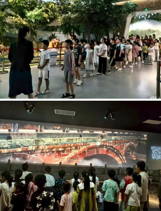 參與活動(dòng)的孩子們一大早便在泰山中路社區(qū)集合完畢, 滿懷期待地乘坐定制公交前往活動(dòng)的第一站——漯河市城市展示館。在專業(yè)講解員的引導(dǎo)下,孩子們依次步入六大主題展廳。展廳以“水、字、牛、匯、食、夢”為敘事主線,巧妙運(yùn)用場景復(fù)原、實(shí)物沙盤、全息投影等現(xiàn)代科技手段,生動(dòng)再現(xiàn)了漯河從賈湖遺址史前文明,到當(dāng)代“漢字文化名城”“食品名城” 的千年演進(jìn)脈絡(luò),讓孩子們直觀感受家鄉(xiāng)的歷史厚度與發(fā)展活力。