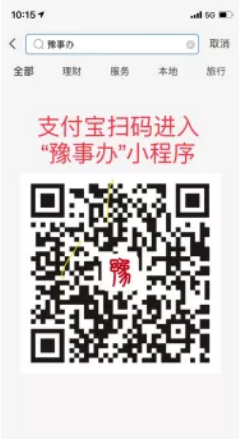 (1)打開支付寶,搜索“豫事辦”,或者掃描下方二維碼進(jìn)入“豫事辦”小程序。