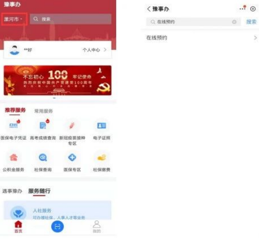 (2)左上角位置切換選擇漯河市,然后搜索“在線預(yù)約”。