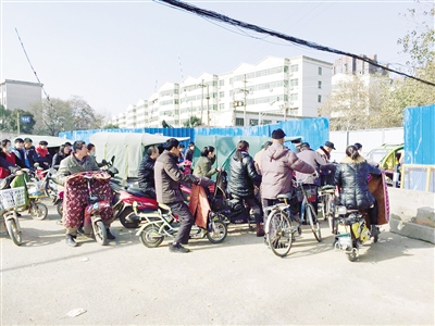 11月30日下午1點,記者來到解放路南段東貨場處的鐵路道口北側,看到鐵道已經被藍色圍擋圍了起來,在靠東側的位置留了一個寬約2米的出入口。在出入口處,擠擠攘攘地圍著20多輛電動車、三輪車、老年代步車等車輛,車主或坐在車上,或下車等待,耐心地等待著能夠通行。一些沒有耐心的車主,選擇調頭繞行,還有個別車主拿出手機打發(fā)時間。在鐵道口南側,等待通行的行人、車輛則排起了長隊。