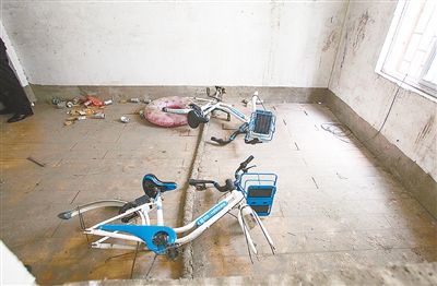 12月21日中午,記者來(lái)到市區(qū)漢江路與太行山路交叉口東北角的一處城中村,見(jiàn)三輛共享單車所在的民房垃圾遍地,一床破舊的鋪蓋堆放在一個(gè)房間里。被拆解的兩輛共享單車,在二樓的一個(gè)房間內(nèi),車輪不見(jiàn)了,車鎖也被破壞。