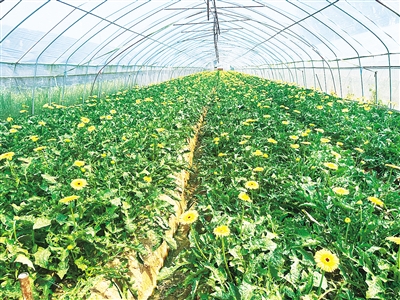 記者在菊花種植基地的大棚里看到,扶蘭、王子、菜花黃、黃白菊幾個(gè)品種的菊花競相綻放,有幾位村民正在忙著除草。