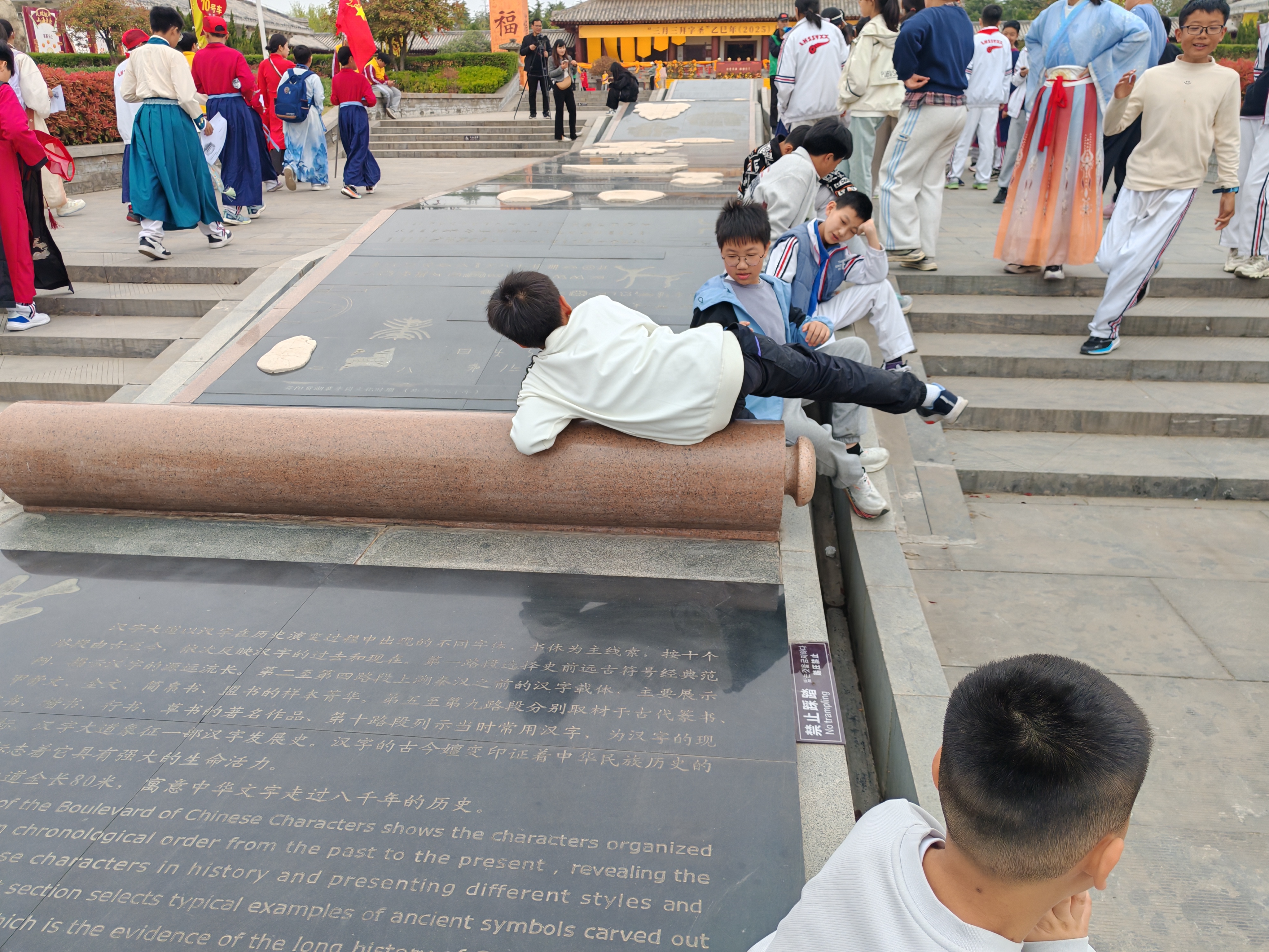 許慎文化園,在清明節(jié)期間有游客坐在漢字大道的不文明行為。