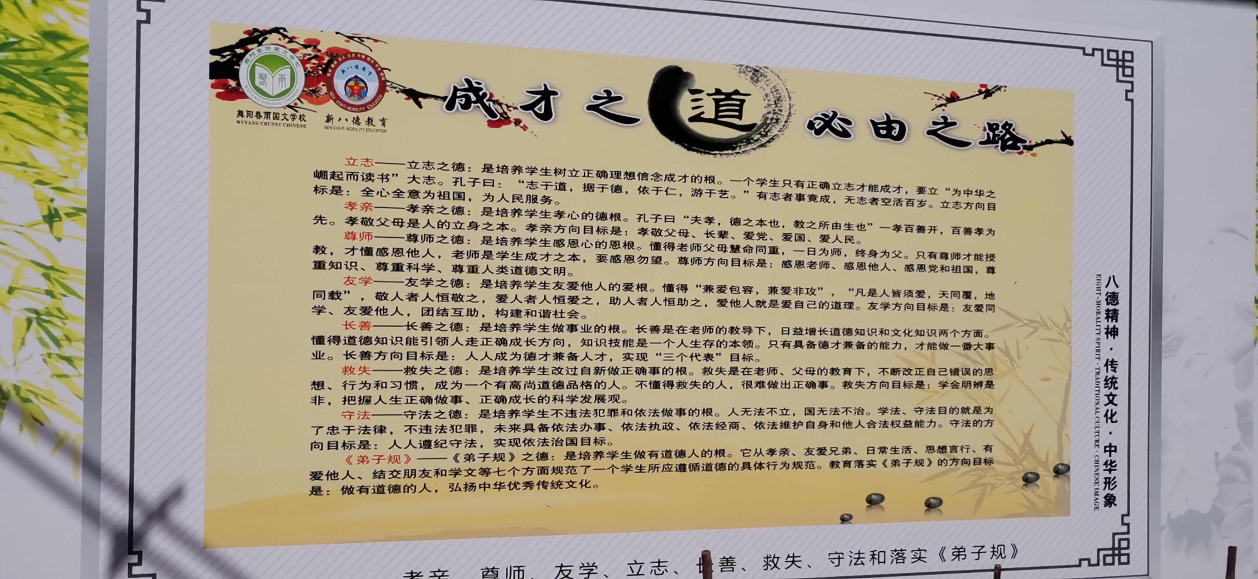 “孝親、尊師、友學(xué)、立志、長(zhǎng)善、救失、守法和落實(shí)弟子規(guī)八個(gè)方面,是培養(yǎng)學(xué)生做人博愛(ài)、做事智慧、言行規(guī)范及拓寬心量的高效的立德樹(shù)人的教育!”朱喜洋校長(zhǎng)對(duì)于新八德教育用于春雨國(guó)文學(xué)校,滿是自豪和驕傲。