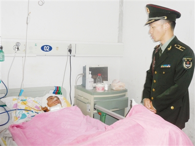 凌偉走到病床前,說起了戰(zhàn)友們對(duì)董亞奇的想念,囑咐他要堅(jiān)強(qiáng),祝他早日康復(fù)(如圖)。隨后,凌偉將戰(zhàn)友們?yōu)槎瓉喥婢璧?.4萬(wàn)元錢交給他的父親。
