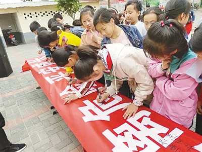 志愿者用一個個實例、一組組數(shù)據(jù),向學校師生和家長講解防溺水安全知識,提醒學生們“遠離危險水域”。隨后,全校師生一起莊嚴宣誓:珍愛生命,預防溺水,遠離危險,平安成長。學生們還認真地在紅色條幅上簽名,表達“絕不一個人下水游泳”的決心。