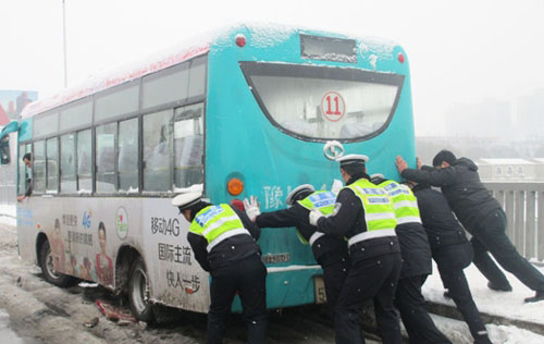 春節(jié)下雪期間 漯河交警一天內(nèi)幫忙推車70多臺(tái)